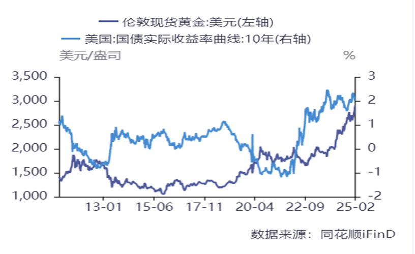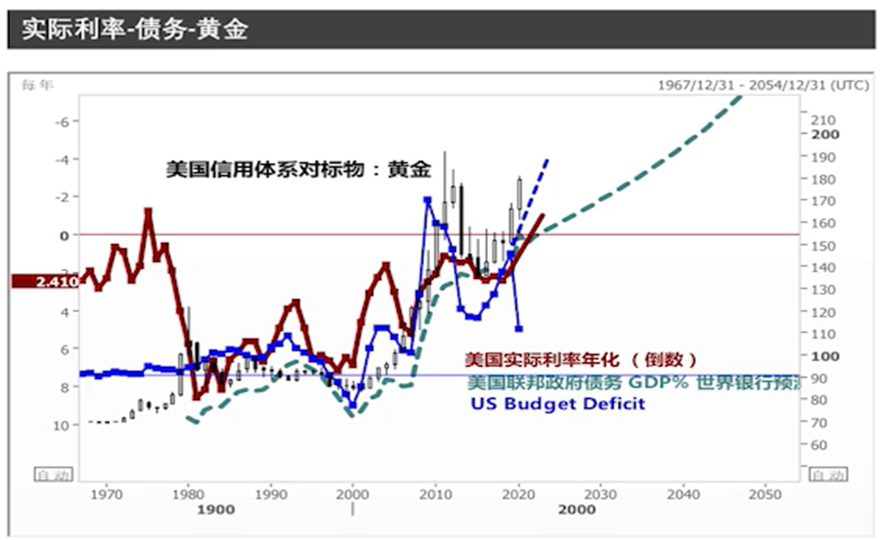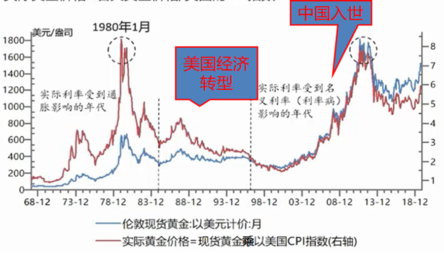 摘要 黄金在过去两年成为全球大类资产中回报最好的资产之一,今年伊始继续不断刷新历史新高,引发市场密切关注。从表面看,全球地缘政治冲突升级,央行购金意愿增强,以及投资需求的激增是推升金价的直接驱动。但隐藏在背后的其实是黄金定价底层逻辑的悄然改变。本文旨在通过复盘过往半世纪黄金价格影响因素的变迁,梳理黄金研究的中观和宏观框架。希望能够以史为鉴,探寻本轮牛市上涨的根本驱动,据此对本轮行情未来的持续时间提供一定的前瞻性指引。 中观层面,黄金价格过去半个世纪以来的定价之锚为美债的实际收益率,二者长期呈现此消彼长的较强负相关性。过去50年,黄金出现了两轮比较明显的牛市,背后驱动均是美国实际利率的下沉,但导致实际利率下降的原因却有根本的不同。第一轮是由于通胀的高企,第二轮为名义利率的下降所导致。除去美债实际利率外,全社会生产率隐含投资回报也是中观层面影响黄金价格的另一维度的重要因素。黄金本质上是无息债券,投资黄金的收益只能来自价格的上涨。从资产配置的角度来看,在经济周期处于滞涨或衰退周期内,黄金价格往往有更好的相对收益。因为这一时间内风险资产的回报预期转差,使得持有黄金的机会成本变小。但在经济复苏和过热期间,黄金价格走势往往较弱,主因此时持有黄金的机会成本大幅升高。 实际利率对黄金价格的解释仅在一定的条件和范围内有效,当利率降无可降,或受到刚性约束时,黄金的定价逻辑需要上升至更高的宏观维度,即美元的信用和美国的债务。从2023年开始,美债实际利率对黄金价格的解释力度下降,即便美债实际利率持续上行,但无法影响黄金价格持续创新高。说明当前黄金的叙事逻辑与过往相比发生了根本性的变化,影响因素已开始从中观上升到宏观层面。美元信用能否再次完成重塑,才是决定本轮黄金牛市能走多远的最根本因素。 第一部分 黄金研究中观框架 一、美债实际利率 图1:美债实际利率预期2020年变化 资料来源:方正中期研究院 图2:美债实际利率与黄金价格走势对比 中观层面,黄金价格近半个世纪以来的定价之锚为美债的实际收益率。具体来看,美债实际利率为美国名义利率减去通胀,所以要判断实际利率要同时考虑名义利率与通胀的变化,当二者走势反向时,实际利率方向较容易判断,但当二者变化的方向一致时,二者变化的速度差决定美债实际利率的方向。更严格的说,名义利率又可分成已知名义利率和名义利率预期,通胀分为已知通胀和通胀预期。对于黄金价格的判断来说,对名义利率预期与通胀预期的判断更为重要,因为金融市场计价前瞻性。举例说明,2020年疫情暴发伊始,美联储短期迅速将联邦基金利率降至0-0.25%,美国名义利率短期快速下降,且短期未出现加息的信号。同时伴随着美联储资产负债表的快速扩张,对居民进行直接的现金补贴,使得美国通胀预期上行。名义利率下降叠加通胀预期上升,使得美债实际利率短期明显下降,推升黄金价格创历史新高。 黄金价格分析的难点在于对名义利率预期和通胀预期的判断,这需要对全球分工,产业迁移,科技进步以及美国信用的损耗和重塑有深刻的理解和把握。 过去50年,黄金出现了两轮比较明显的牛市。第一次是在上世纪70年代,即布雷顿森林体系解体之后。另一次是在进入本世纪后的前十年,即中国加入WTO后。两轮牛市的背后驱动均是美国实际利率的下沉,但导致实际利率下降的原因确有根本的不同。 上世纪70年代在石油危机,布雷顿森林体系崩塌以及美国倾向于用通胀换取就业的货币政策的共同影响下,美国出现恶性通胀,至80年代初通胀数据已升至两位数。导致这一期间美国实际利率受通胀的影响而大幅下降,从中观的角度可以说通胀是这一阶段黄金价格上涨的主要驱动。从黄金现货价格与其实际价格(现货价格乘以通胀)的走势对比来看,这一时期差异较大(如下图3)。我们传统认知中的所谓黄金能抗通胀,在这一时期是适用的。进入80年代后,时任美联储主席的保罗沃尔克开启史无前例的鹰牌加息,将美国名义利率一度加至20%,有效压制了总需求。同时叠加这一时期石油美元体系的建立,使得原油价格波动率降低,美国的实际利率开始止跌上升,黄金的牛市也随之结束。 图3:黄金价格驱动近半个世纪的变化 进入21世纪后,随着中国进入WTO,嵌入全球产业链,全球尤其是美国制造业逐步向中国转移。在中国相对低廉的劳动力成本影响下,全球通胀下降至低位水平。对于美国来说,成功地实现了从传统工业国转型成以科技和服务业为驱动的经济体。回溯历史,二战使得美国的工业生产能力得到充分的释放,战后美国顺理成章地成为了全球的制造业中心。上世纪1950-1970年间,美国经济更多地由传统产业主导,比如钢铁,石油,汽车等。这一时期美股走势最好的是“漂亮50”,成分股也多集中在传统产业。但70年代美国经济陷入“滞涨”,美联储主席保罗沃尔克大幅升息,在20%的极高名义利率下,传统行业本就已奄奄一息。随着里根的上台,美国开始对旧产能进行了大刀阔斧的出清。之前持续了20年的“漂亮50”行情结束,美股在1970-1985年期间几乎没有上涨。而在旧产能出清的同时,美国经济新的动能逐步形成,80年底中后期开始,信息技术革命开始在美国酝酿。进入90年代后,美国正式进入一日千里的