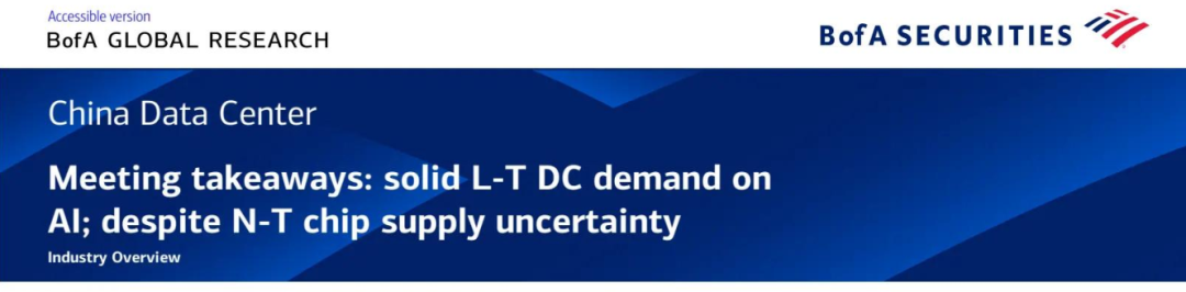 9月16日,美银在香港亚太会议期间对话世纪互联、万国数据等行业头部公司,随后抛出了一份重磅研报:AI正推着中国数据中心走进“长期刚需时代”,但短期芯片供应的不确定性,可能成为制约市场的重要因素。