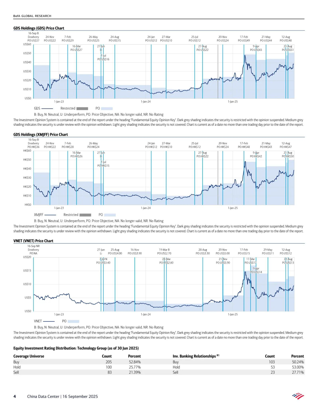 投资视角:机构青睐这些玩家,风险需留意 在国内数据中心板块,美银明确给出了“首选标的”——世纪互联(VNET)和万国数据(GDS),核心逻辑是两者在产能交付、能源获取等方面的优势显著。
