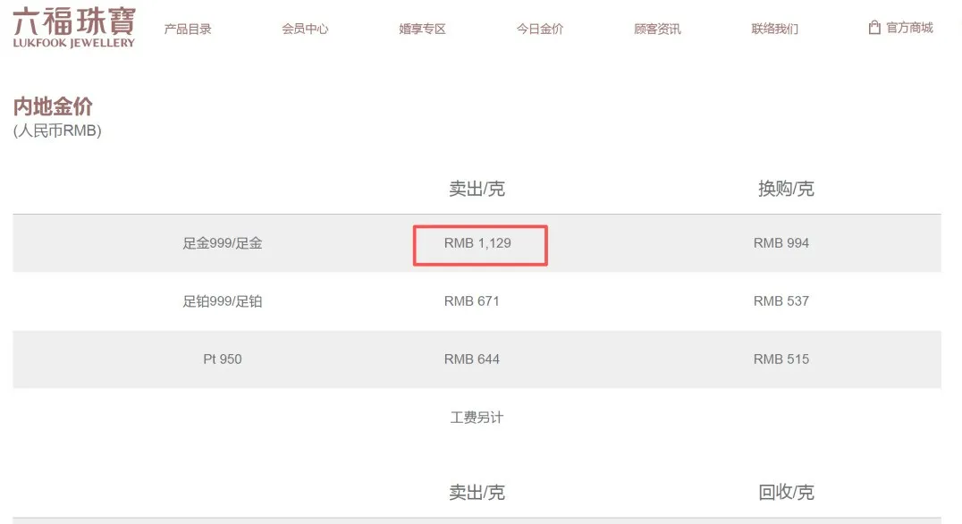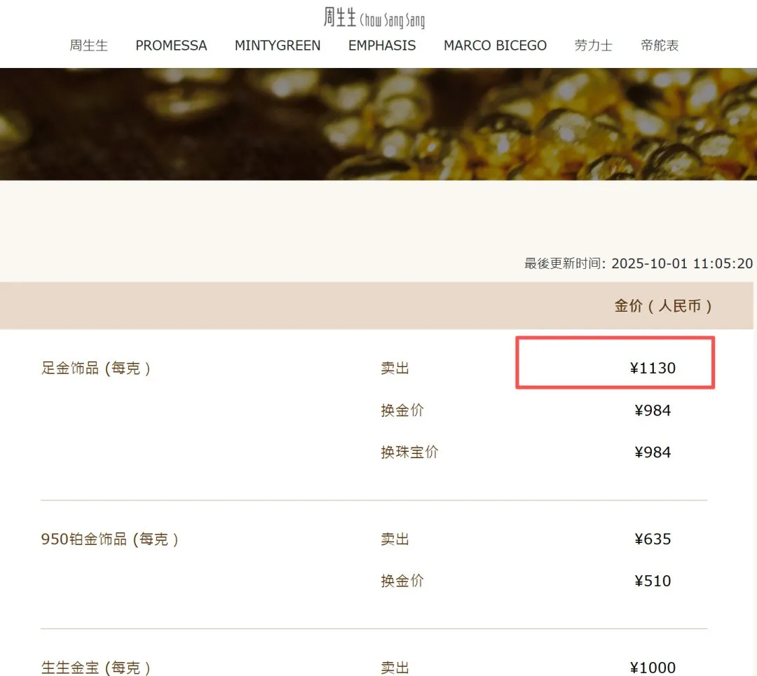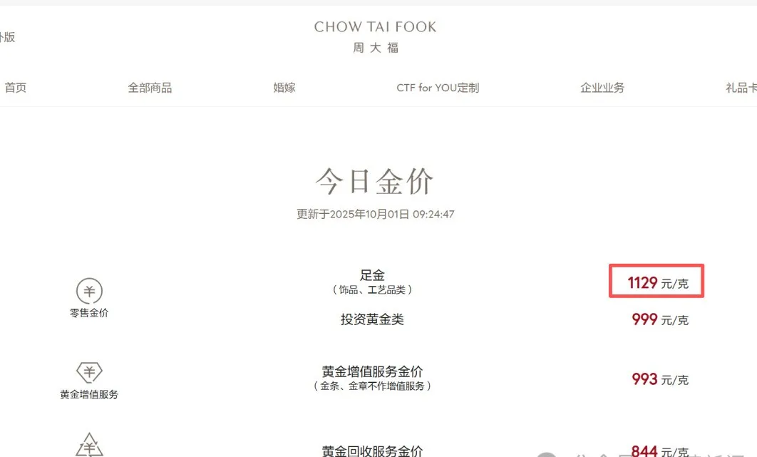 周大福、六福珠宝等品牌足金首饰价格涨至1129元/克,较9月29日1108元/克上涨21元/克。