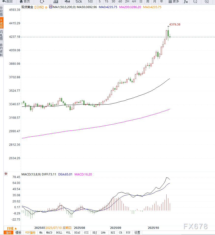 黄金在高位小幅回升,延续了上周五创纪录高点后的盘整走势。尽管价格在短线出现回落,但多重避险因素仍为黄金提供支撑,使其在4245美元附近维持韧性。 ![]() 此外,美国及全球财政赤字和政府债务高企,加剧了经济和市场的潜在风险,为非收益性资产黄金提供额外支撑。 地缘政治风险同样影响市场情绪。近期乌克兰无人机袭击俄罗斯油气设施事件,加剧了地区紧张局势,使投资者持续关注潜在的冲突升级。这类事件往往推动投资者寻求黄金等避险资产。 最后,美联储的政策预期也为黄金提供支撑。CME FedWatch 工具显示,市场已完全计入美联储今年两次降息的预期,使美元难以反弹,从而利好非收益性资产黄金。 市场参与者同时关注即将公布的美国消费者通胀数据和 10 月 FOMC 政策会议的结果,这些因素可能进一步影响美元走势及黄金需求。 综合来看,多重避险因素、地缘政治紧张、政府财政与经济不确定性,以及美联储宽松预期,构成了黄金价格维持高位震荡的基本面背景。 从日线图来看,黄金在4275美元附近遇到短期阻力,多次试图突破未果,形成高位震荡格局。下方支撑集中在4210至4200美元区间以及4186美元的上周五低点。 技术指标显示,相对强弱指数(RSI)虽从高位回落,但仍在中性偏上区域,短线多头动能仍存在;MACD 柱状图呈现缩量,显示高位回落压力尚存。 布林带日线显示价格接近中上轨,短期内黄金可能维持4210至4275美元区间震荡,等待 FOMC 政策和美国通胀数据明确方向。 ![]() 黄金短线承压回调后显示出一定韧性,4200美元整数关是关键支撑。若上破4275美元,则黄金有望挑战4300美元以及历史高点4380美元;反之,下破4160美元区间可能触发更深幅度调整至4100美元。 市场在 FOMC 前可能保持谨慎观望,短线波动性料将加大。 |
