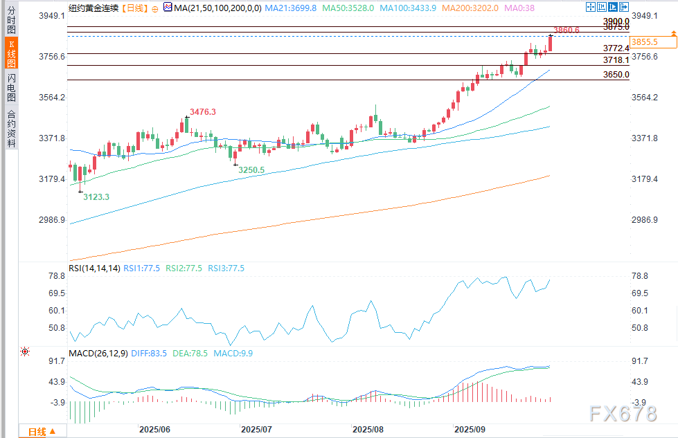 汇通财经APP讯——周一(9月29日)美盘早盘,黄金和白银价格走高,其中黄金再创历史新高,白银则触及14年来新高。市场对避险资产的需求凸显,原因是美国政府可能在本周中段陷入停摆。12月交割的黄金期货(现阶段高于现货金价格约30美元)盘中报3856.80美元/盎司,上涨48.00美元;12月交割的白银期货盘中报47.23美元/盎司,上涨0.574美元。 隔夜全球股市涨跌互现,整体偏强。纽约交易日开盘时,美国主要股指预计将高开。 美国国会高层领导人今日将在白宫与特朗普总统会面,就一项短期支出法案展开讨论——该法案需在截止日期前通过,以避免联邦政府在周三停摆。民主党方面坚持,法案必须包含延长医疗补贴以及恢复医疗领域预算削减的内容;而共和党则表示,这些议题的谈判可在避免政府停摆后再进行。该短期支出法案仅能为政府提供资金至11月中旬,且必须在10月1日前通过。在参议院,共和党需要至少获得部分民主党议员的支持才能推动法案通过。受政府停摆不确定性影响,美元本周开局承压。此外,特朗普打破了数十年来的惯例(以往政府停摆后,停薪留职的联邦雇员通常可在资金恢复后返岗),威胁称若政府停摆,将永久解雇那些“非必要”且无资金支持的联邦雇员,此举进一步加大了局势的风险。 其他方面,彭博社一篇报道指出,由于石油输出国组织及其合作伙伴(OPEC+)仍在执行夺回全球市场份额的战略,该联盟或于11月再次提高石油产量。10月5日OPEC+将举行线上会议,届时可能会考虑至少增加13.7万桶/日的产量(与10月计划增幅持平)。不过彭博社也提到,目前尚未做出最终决定,会议前的讨论仍有可能发生变化。值得注意的是,OPEC+10月的计划增幅已远低于前两个月宣布的增幅,且当时有代表强调,由于部分成员国缺乏增产能力,实际产量增幅可能会更小。受此消息影响,纽约商品交易所(Nymex)原油价格本周交易开局承压。 高盛集团一份报告显示,鉴于美国经济表现稳健、股市估值具备支撑,且美联储释放鸽派转向信号,预计全球股市有望将涨势延续至年底。高盛在报告中写道:“强劲的盈利增长、美联储在无衰退背景下的宽松政策,以及全球财政政策宽松,将继续为股市提供支撑。鉴于衰退风险可控,我们建议在年底前逢低买入股票。” 今日关键外围市场动态如下:美元指数小幅下跌;原油价格走低,现报每桶64.25美元左右;基准10年期美国国债收益率目前为4.15%。 今日将公布的美国经济数据包括:成屋待完成销售数据,以及得克萨斯州制造业前景调查。 技术分析 (COMEX黄金日图 来源:易汇通) 从技术面来看,12月黄金期货多头在近期整体技术面占据明显优势。多头的下一个上行目标是推动期货收盘价突破4000美元/盎司的关键阻力位。空头的近期下行目标则是将期货价格压至3700美元/盎司的关键技术支撑位下方。第一阻力位见于3875美元/盎司,进一步阻力位在3900美元/盎司;第一支撑位见于3800美元/盎司,进一步支撑位为隔夜触及的本周低点3785.50美元/盎司。 从技术面来看,12月白银期货多头在近期整体技术面同样占据明显优势。白银多头的下一个上行目标是推动收盘价突破50.00美元/盎司的关键技术阻力位。空头的近期下行目标则是将收盘价压至44.00美元/盎司的关键支撑位下方。第一阻力位见于47.50美元/盎司,进一步阻力位在48.00美元/盎司;第一支撑位为隔夜低点46.27美元/盎司,进一步支撑位在46.00美元/盎司。 北京时间22:43,现货黄金报3825.86美元/盎司,涨幅1.72%。现货白银报46.934美元/盎司,涨幅1.92%。COMEX黄金报3855.3美元/盎司,涨幅1.22%。COMEX白银报46.934美元/盎司,涨幅1.08%。 |